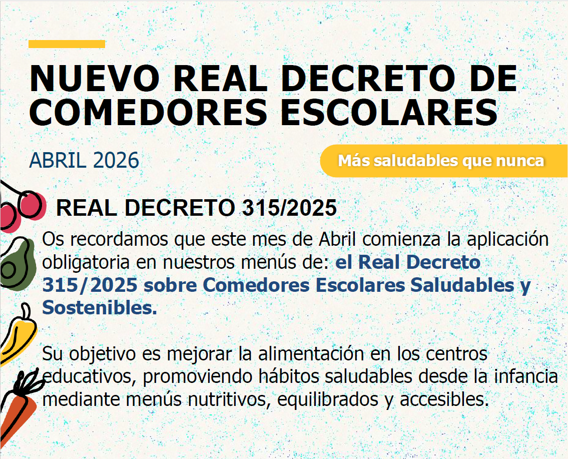 Os recordamos que este mes de Abril comienza la aplicación obligatoria de nuestros menús de: el Real Decreto 315/2025 sobre Comedores Escolares Saludables y Sostenibles.